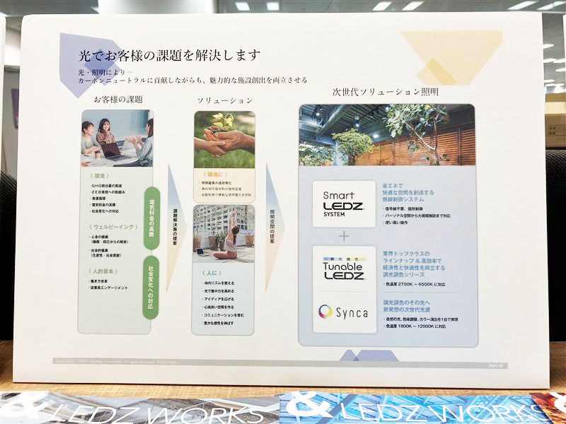 先般実施した展示会ではSDGsについての知識を深め、全社員に楽しんでもらえるよう様々な視点からSDGsについて紹介しました。メーカー様にご協力いただき、照明機器の実機や色温度の比較機器、植物由来の可塑剤と自然由来の意匠で作ったナチュラル質感のタイル、天然素材から生まれたリノリウム床シートの見本などを展示しました。