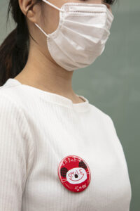 衛生面を考慮し、マスク着用で接客をしているスタッフ用に、オリジナル缶バッジを作成いたしました。
